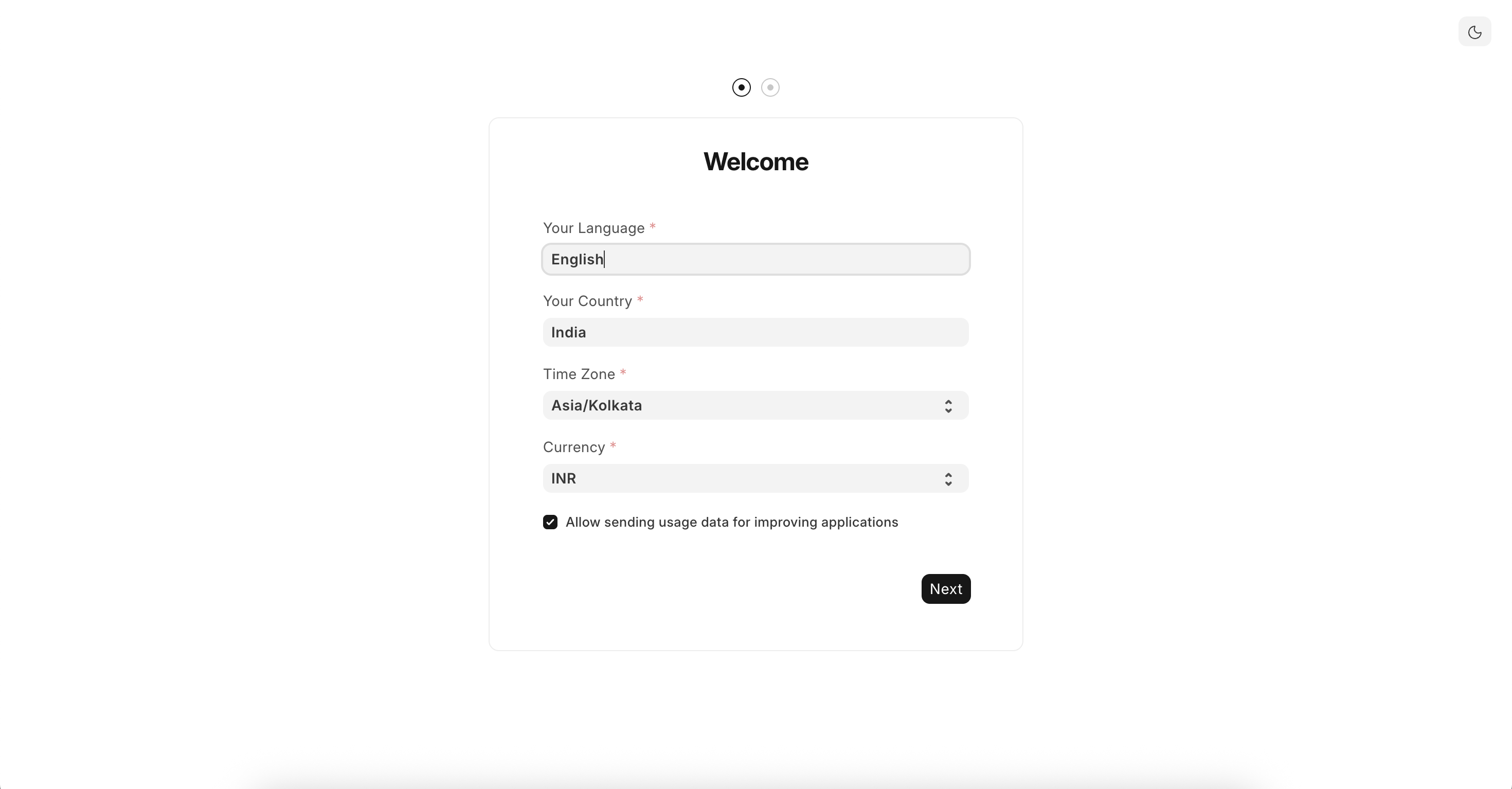 You'll start with a Welcome screen. Pick your language, confirm your country, set your timezone, and choose your currency. These make sure dates, times, and deal values show up correctly across your CRM.