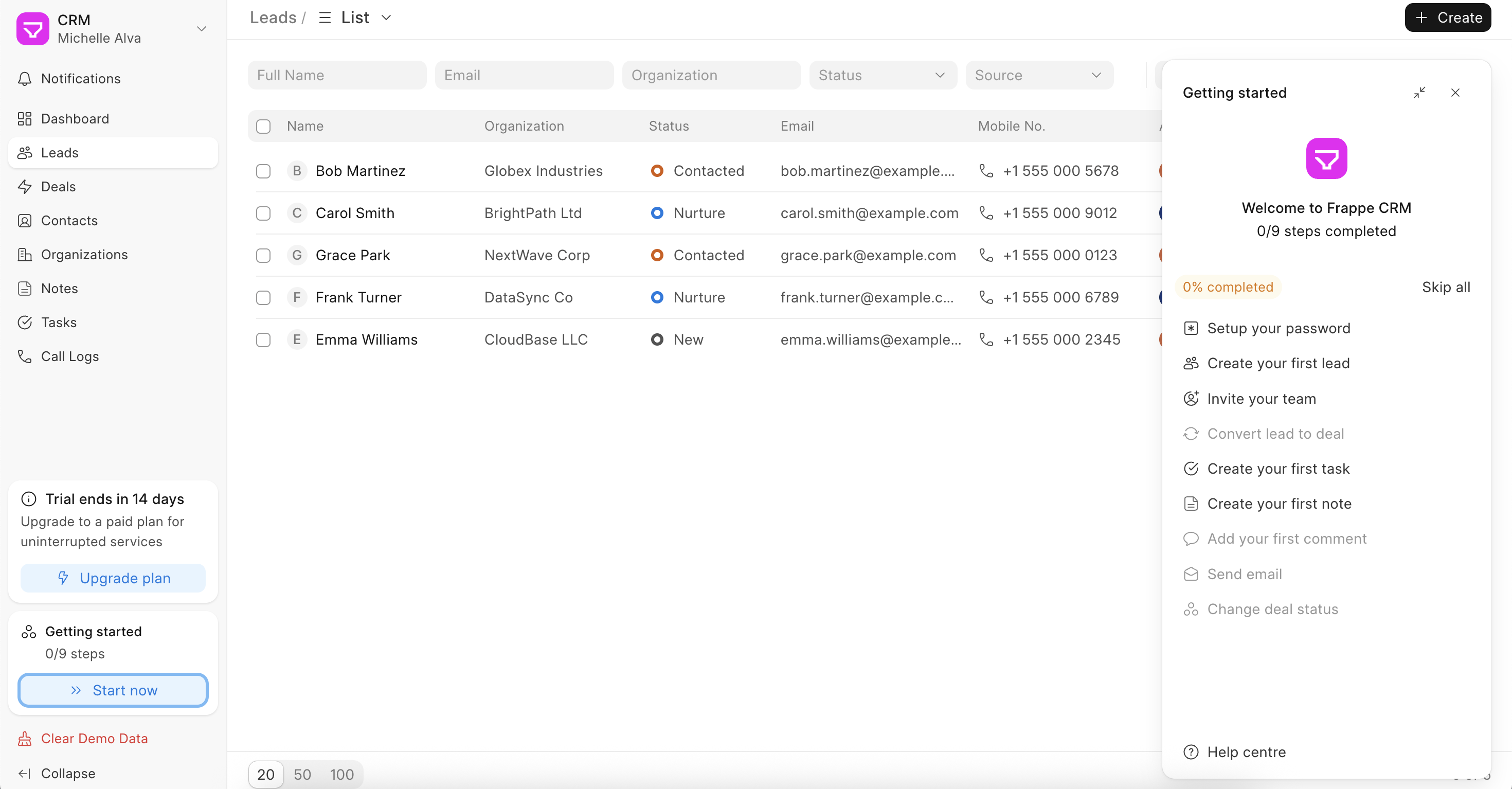 What you're looking at is the CRM frontend. This is what your sales team will use every day. It's clean, focused, and built for speed. When you first land inside the frontend, you'll see some demo data already in place – a few sample leads with names, organizations, and statuses.