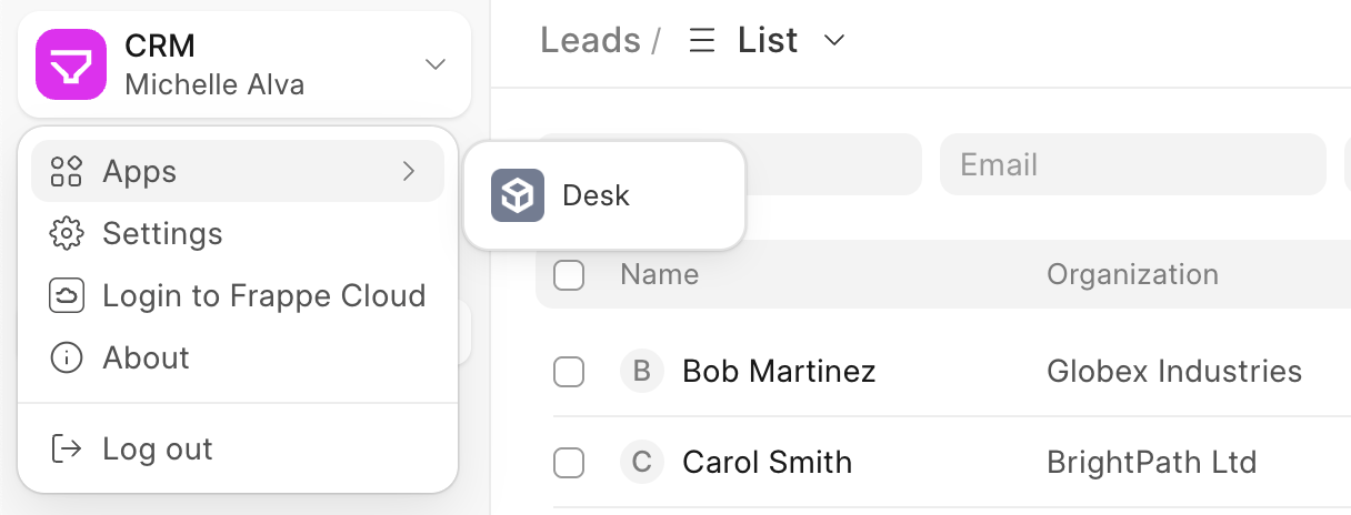 To get there, click on the CRM logo at the top left, then go to Apps > Desk.