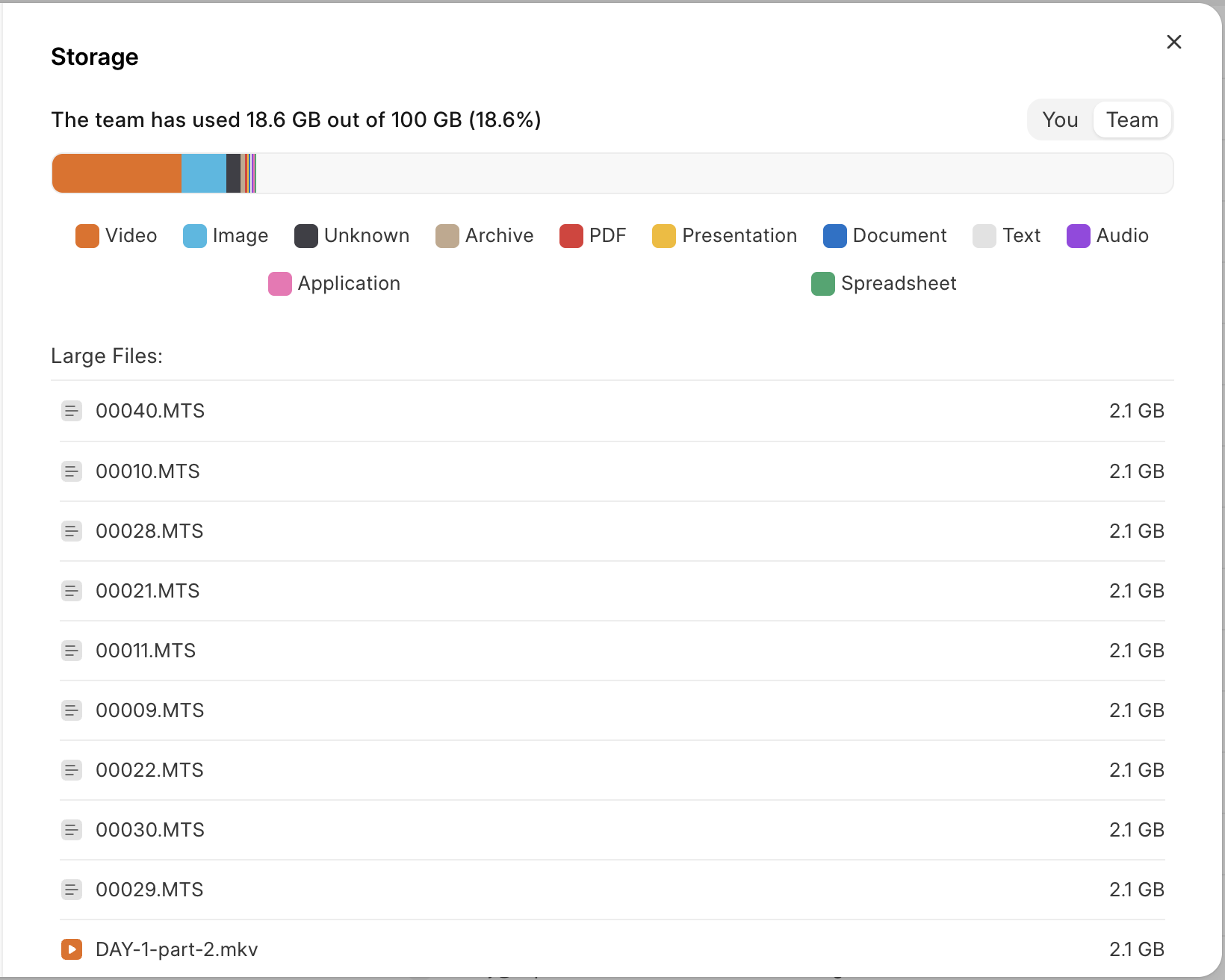 Frappe Drive offers a comprehensive breakdown of your storage. You can see both the team's and your personal files'. We also highlight the files contributing most to your storage, if you wanted to cut down on your cloud storage.