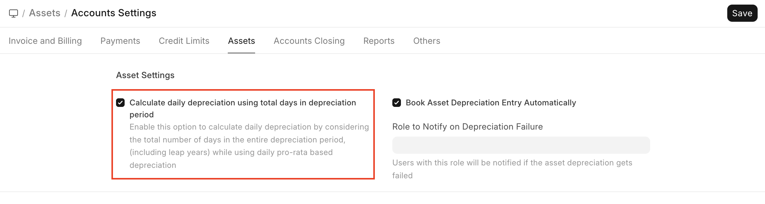 In the Accounts Settings of ERPNext, there is a check box that allows users to enable "Calculate daily depreciation using total days in depreciation period" checkbox.