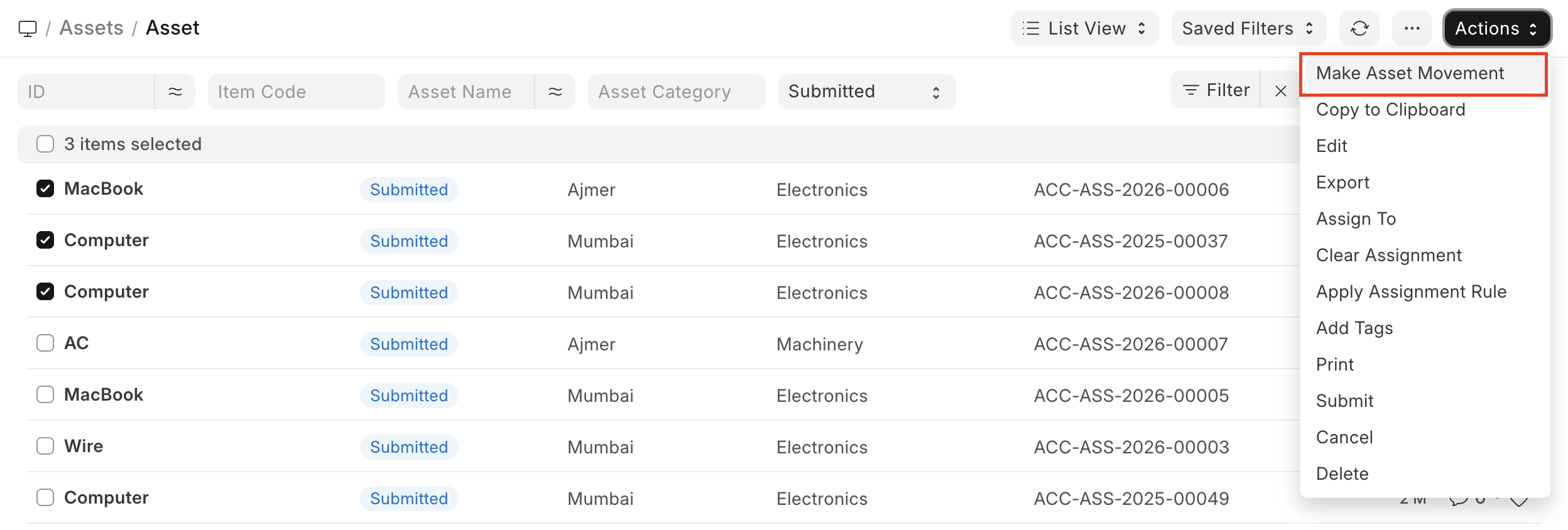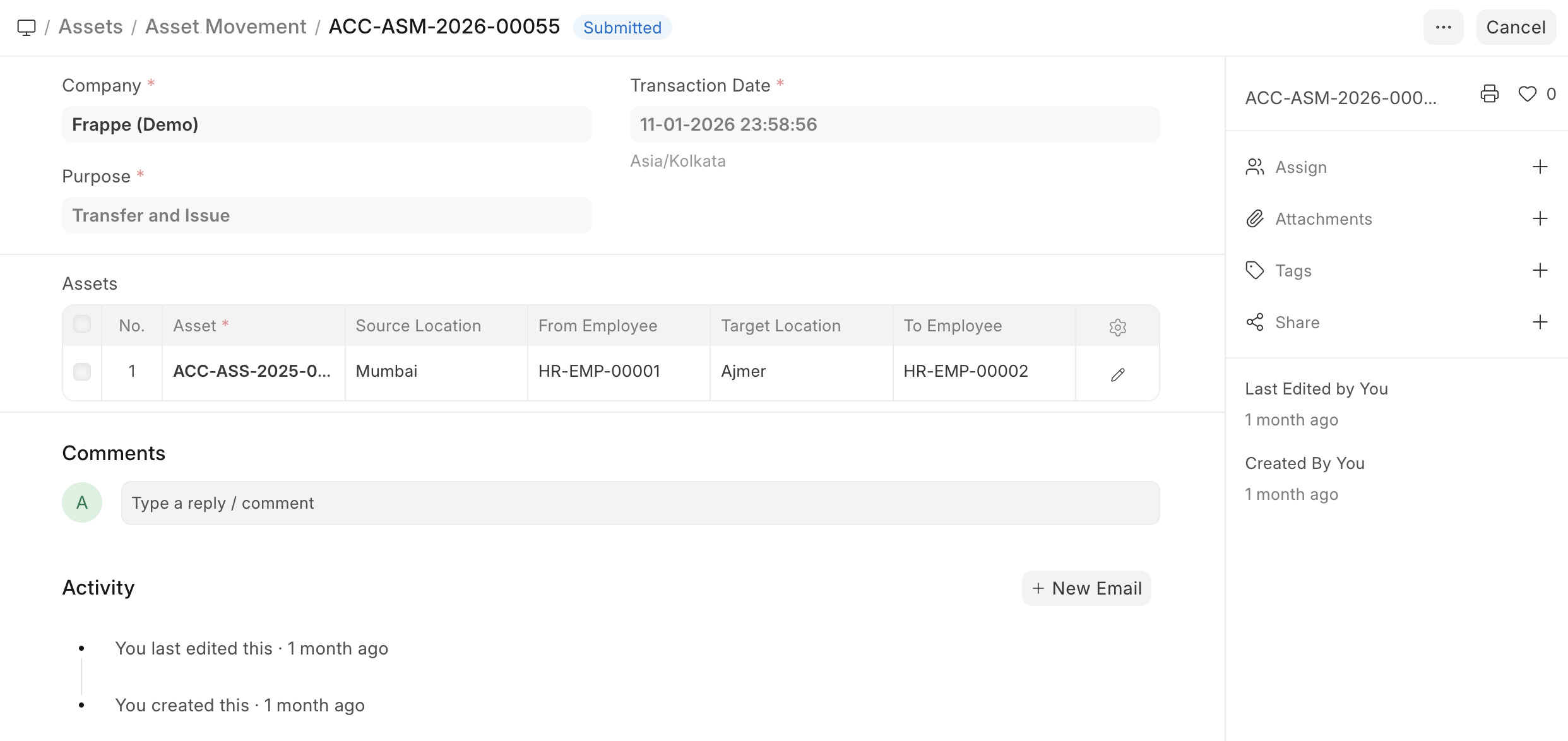 This feature helps you track the physical movement and custody of Assets within your organization. You can move an Asset from one warehouse to another, assign it to an employee, or record its return.