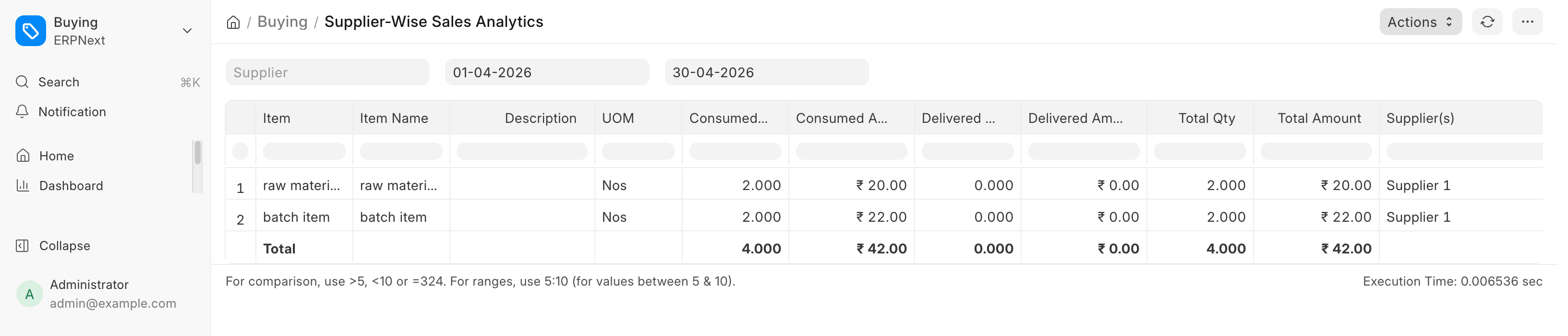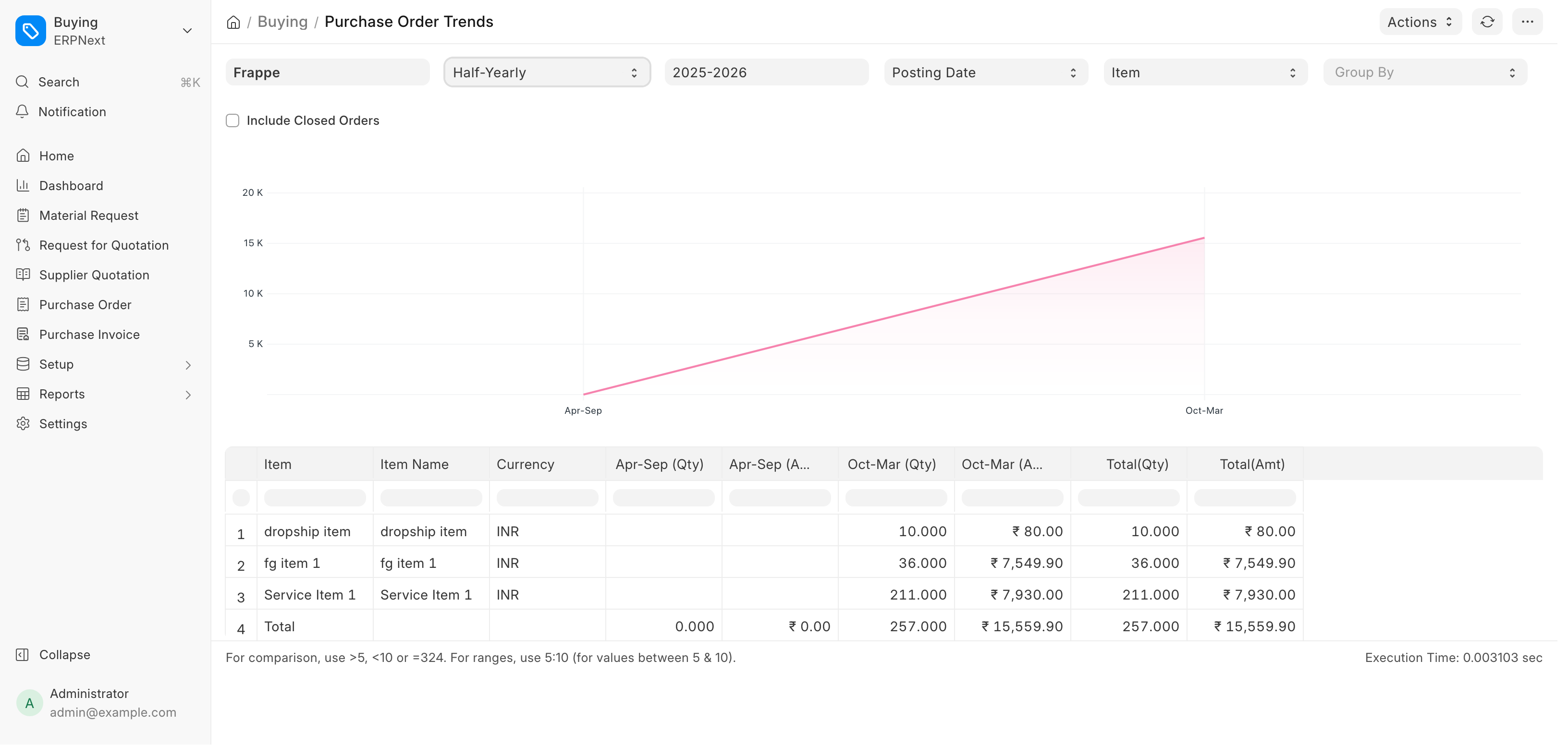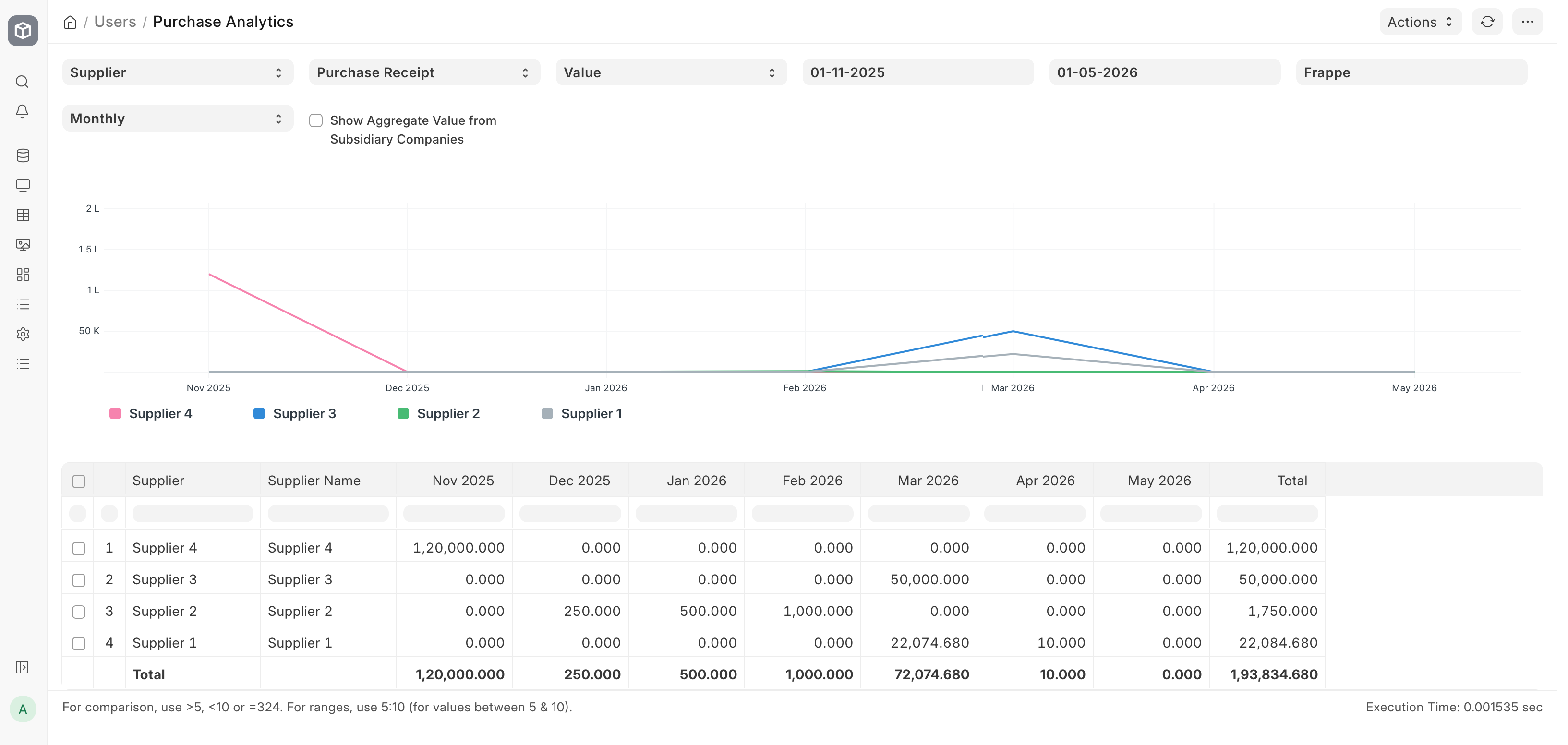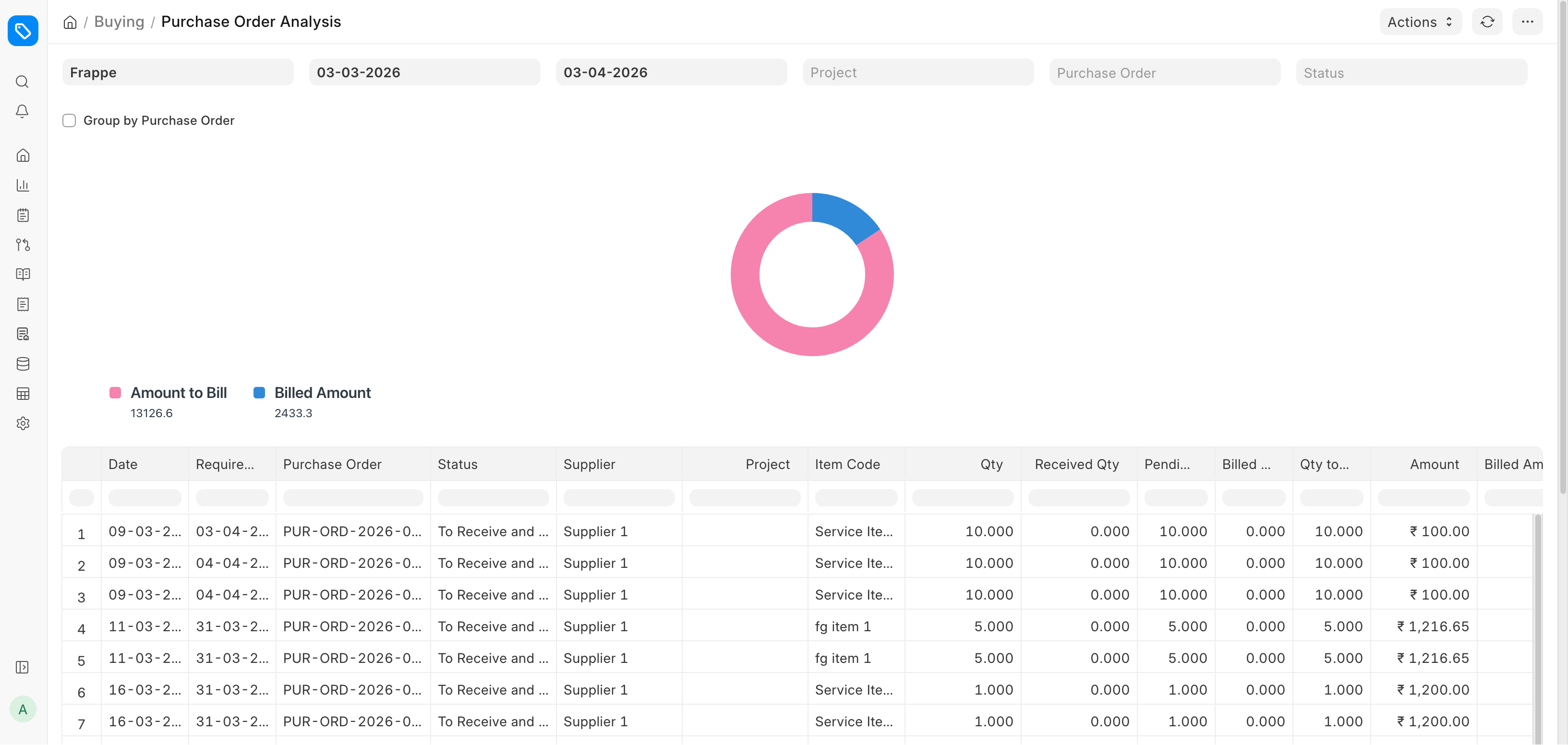 Through the Purchase Analytics report, the purchase-related data against the supplier, supplier groups, items and item group can be analyzed over a given period and frequency.