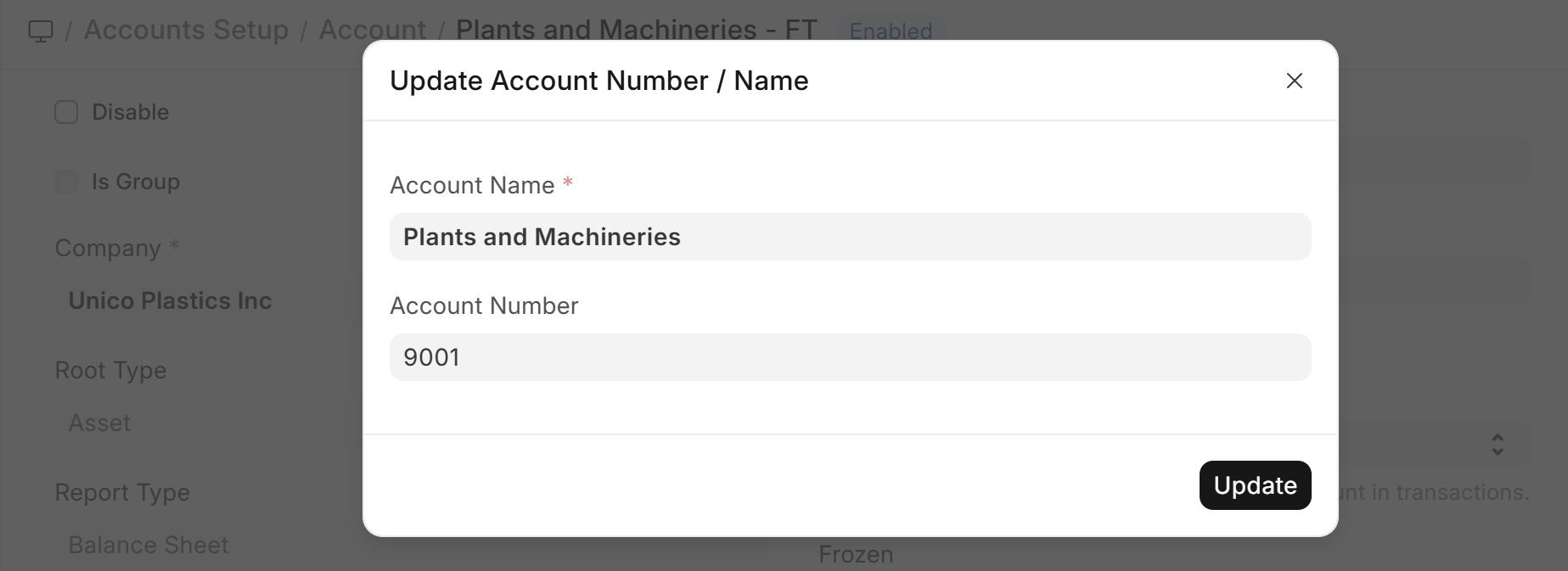 You can assign a number while creating an account from Chart of Accounts page. You can also edit a number from account record, by clicking Update Account Name / Number button. On updating account number, the system renames the account name automatically to embed the number in the account name.