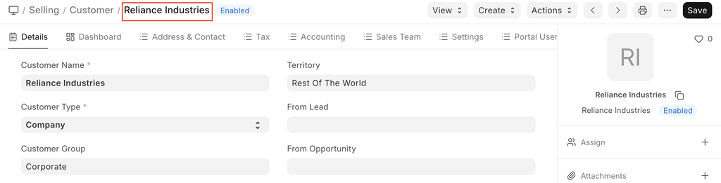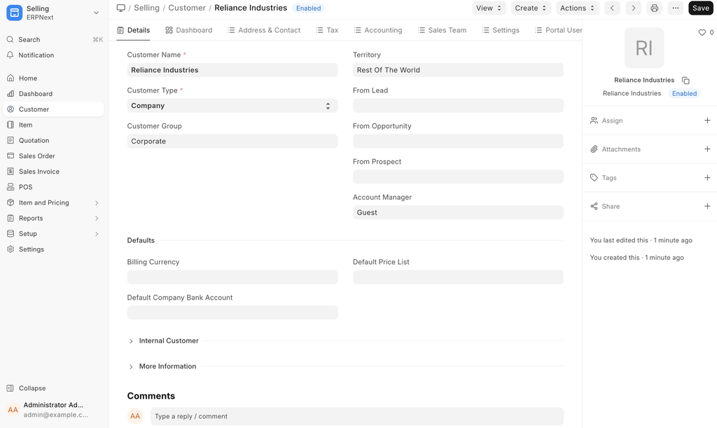 Advanced Tip: ERPNext supports Multi-company Accounting. You can use the same customer records in multiple companies. Since an accounting ledger is company specific, you need to select the company and the corresponding ledger in ACCOUNTING section if you decide have separate accounting ledger for a customer.