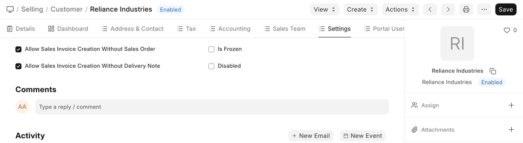 Similarly, you can set the default price list to be used for this customer in sales orders and sales invoices by selecting the appropriate currency in Default Price List.