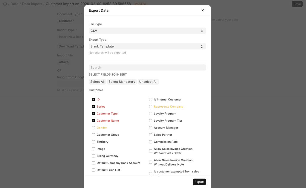 - Once the Export Type is selected, all the fields are displayed below. The ones in red are the mandatory fields, and the yellow ones indicate the depends on fields