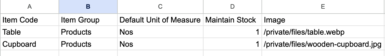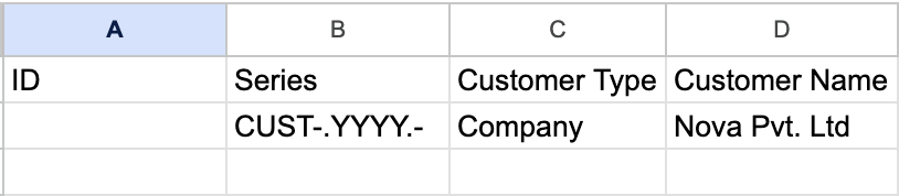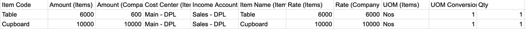 - Now, in the downloaded template, we consider that the Sales Invoice, child table for items, has 2 entries, to handle that, we will be adding the records like this: