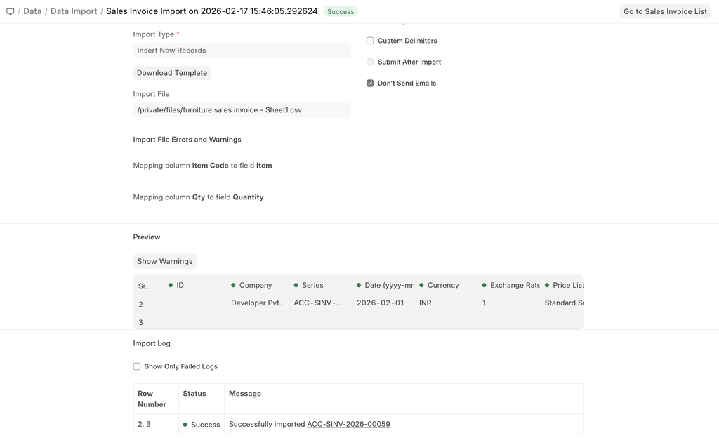 This guide explains how to import existing Sales Invoice records from a legacy system into ERPNext using the Data Import Tool.