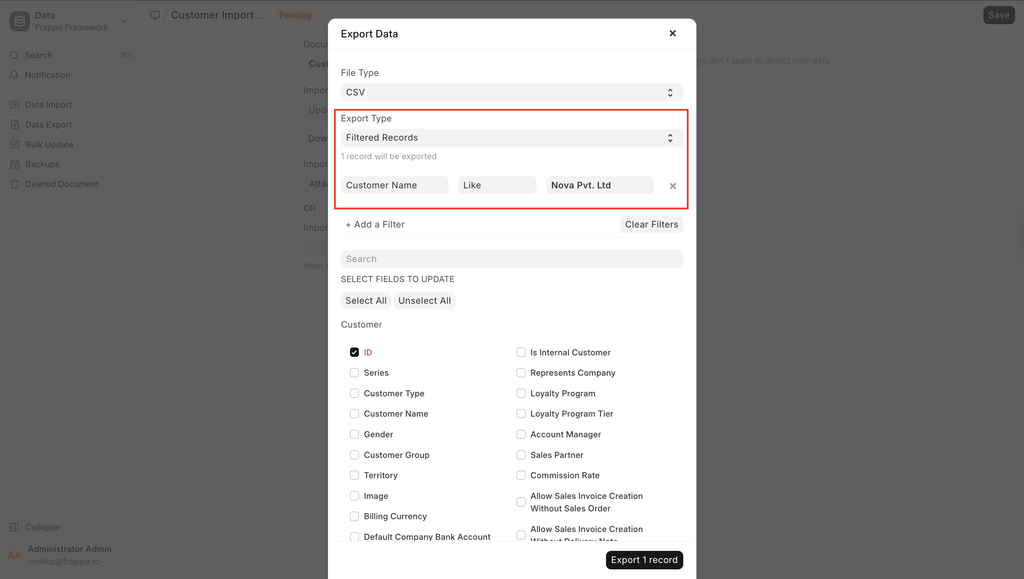 We start by downloading the template. While doing this, since we want to update, we can use filters to extract the exact records and import them back for updating.