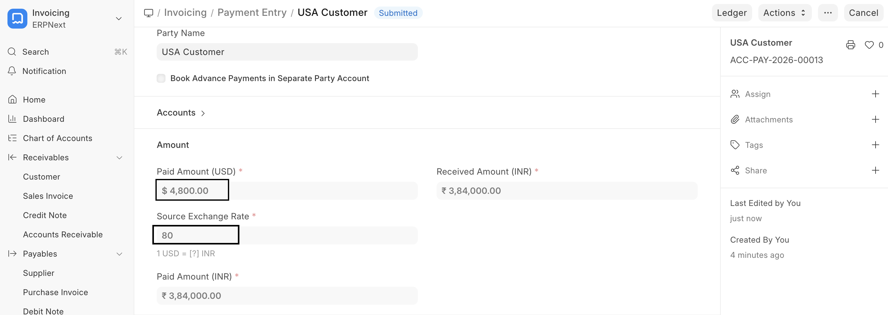 In this field, enter the actual amount realised in the bank account. As per our use case, it will be $48,800, even though the invoice amount is $ 4,810.