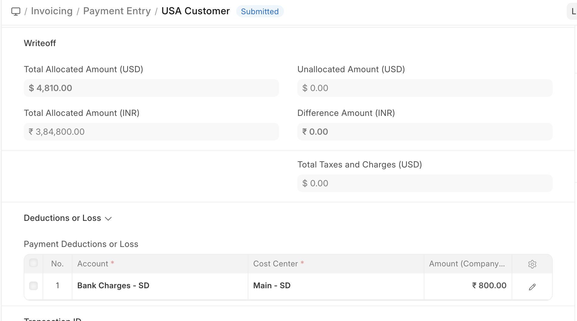 When a customer wires a payment amount through a bank or payment gateway, a transfer fee is applied to the transaction. This results in a difference between the amount paid by the Customer (equal to the invoice amount) and the amount credited to our bank account. In ERPNext, you can allocate this difference amount under the Payment Deductions or Loss section.