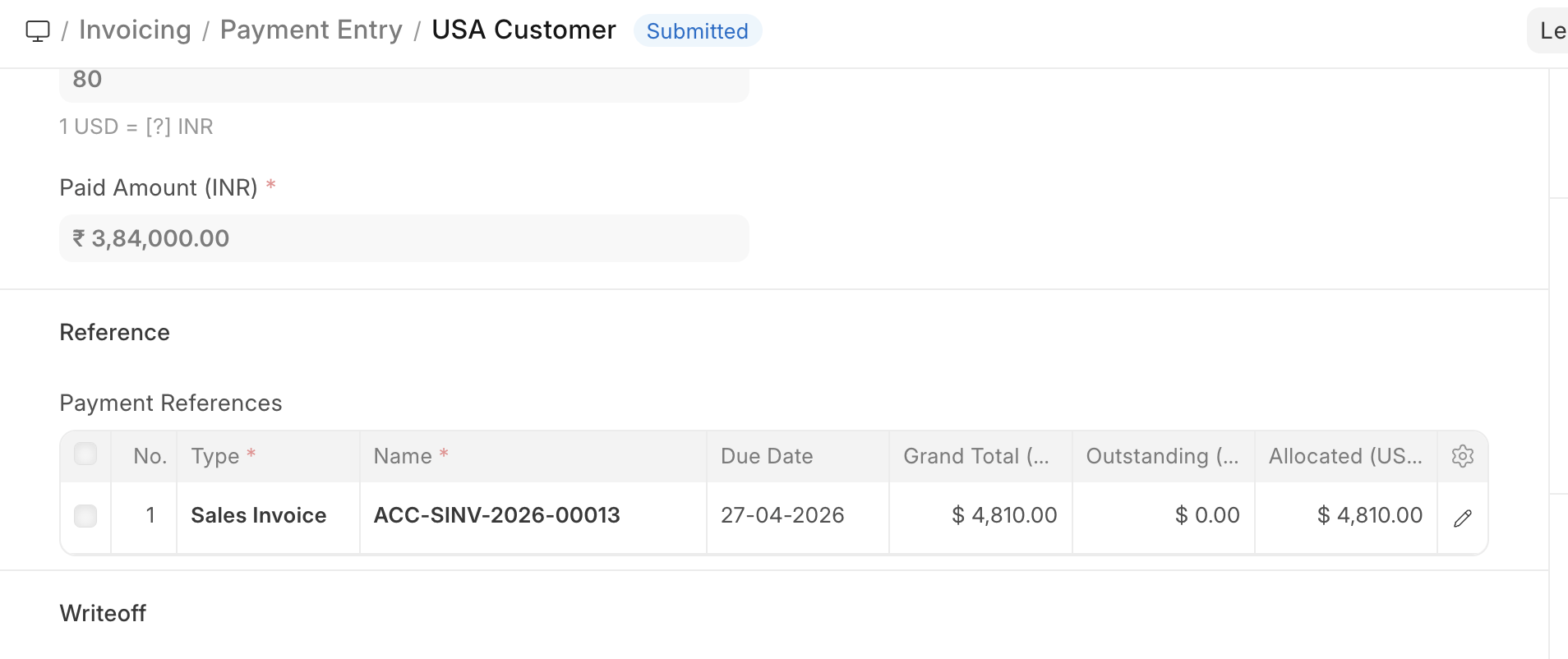 In the Payment Reference table, ensure $4,810 is updated to Allocated Amount so the invoice is marked as paid.