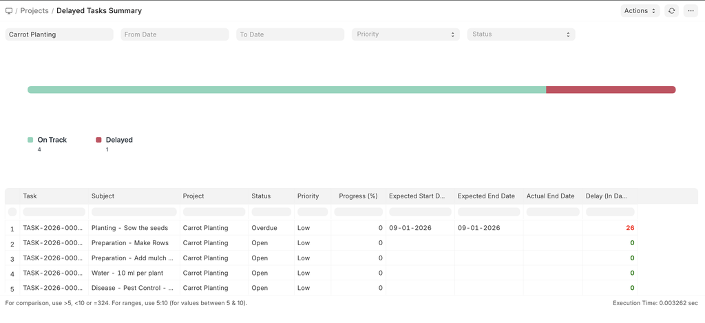 This report helps analyze tasks that have moved into a delayed state. It provides visibility into both on-track and delayed tasks, along with their current progress and the expected start and end dates, enabling users to identify schedule deviations and take corrective action.