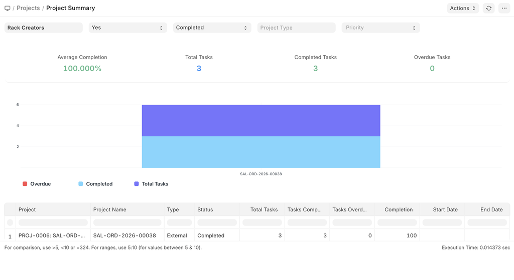 The Project Summary provides an overview of key project information, including the current project status, start and end dates, and a consolidated view of related records. It displays the number of associated Tasks and Timesheets, allowing users to quickly assess project progress and activity at a glance.