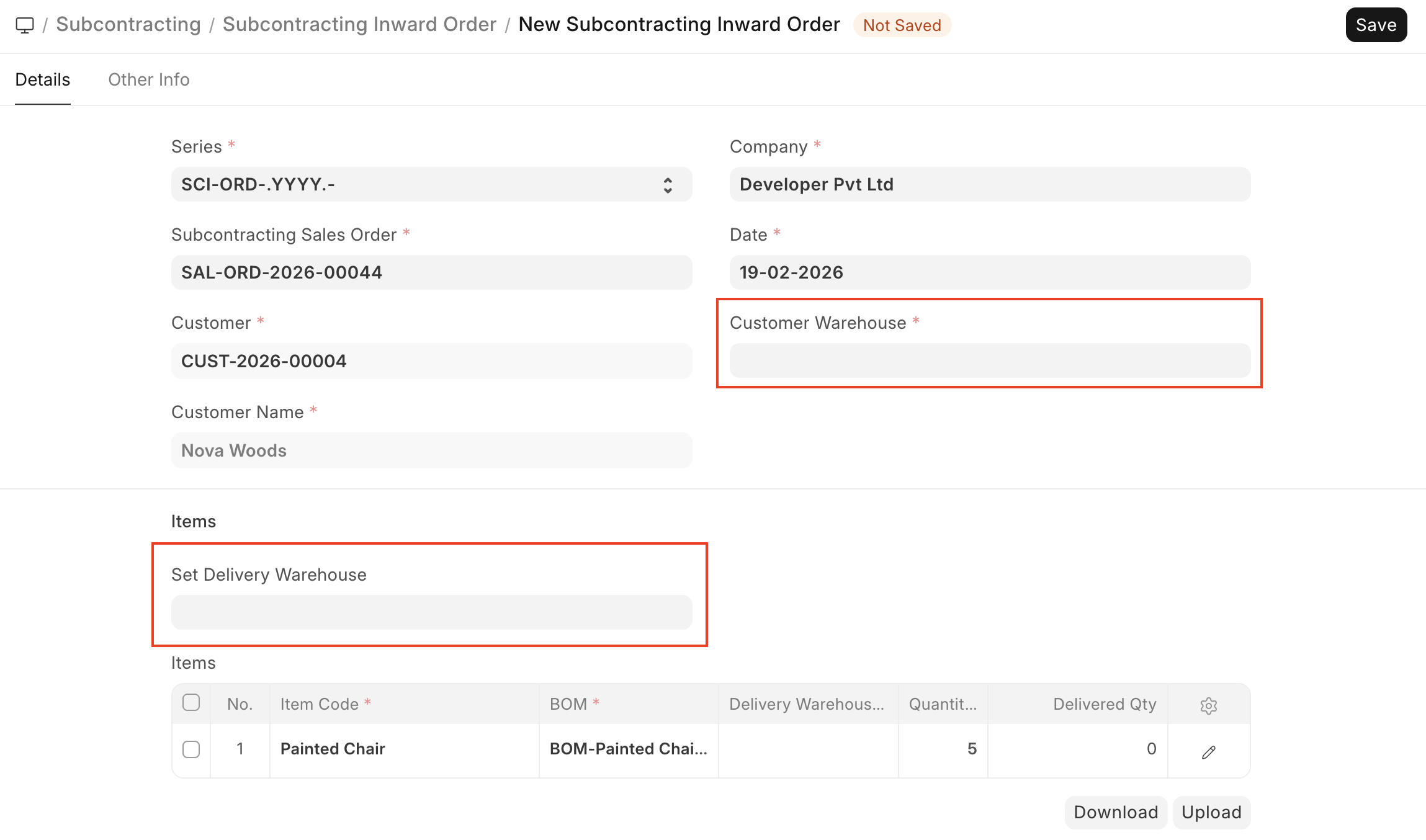 Create > Subcontracting Inward Order. This DocType holds the list of Finished Goods, Raw Materials required, Service Items and Scrap Materials (if produced). Start by selecting the Customer warehouse you created at the start of the process. If only a single Customer warehouse exists against the Customer, the field will be pre-filled with it. Then select a Delivery Warehouse for each of the Finished Goods to be produced. This will be where the Finished Goods produced by you will be delivered. If all the Finished Goods are to be delivered to the same warehouse, use theSet Delivery Warehousefield to set the delivery warehouse for all the Finished Goods in one go.