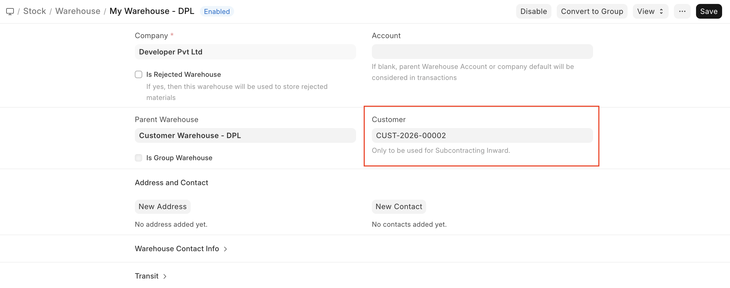 - Every Customer needs to have their own warehouse (dummy) in the masters. This is done by creating a new Warehouse and setting the newly added Customer Link field.