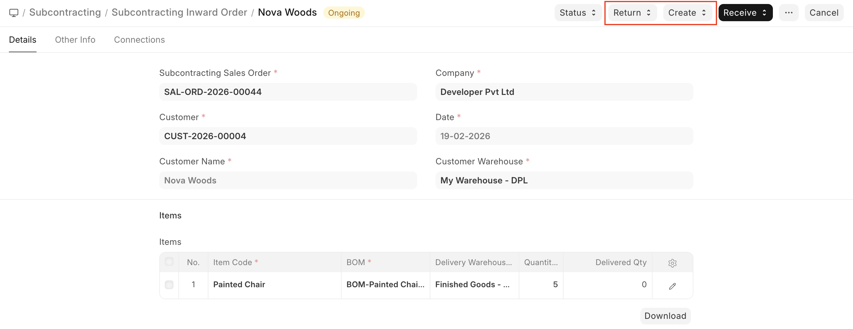 - Go back to the Subcontracting Inward Order and reload the page. You will now see two new buttons at the top right, “Return” and “Create”. By clicking on
