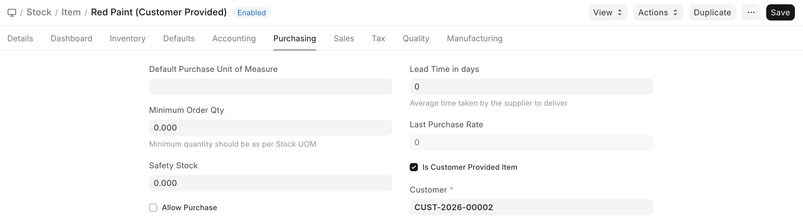 - The Raw Materials provided by the Customer in the Item master. Each Customer Provided Item needs to have the field set in the master. Conversely, Customer Provided Items cannot be purchased so the
