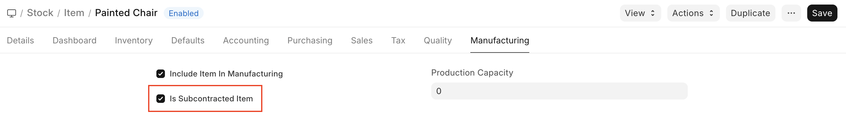 - Start by creating a Sales Order and check the “Is Subcontracted” checkbox. The Sales Order will now be subcontracted and the schema/form of the child table will change. Proceed by setting the service item in the