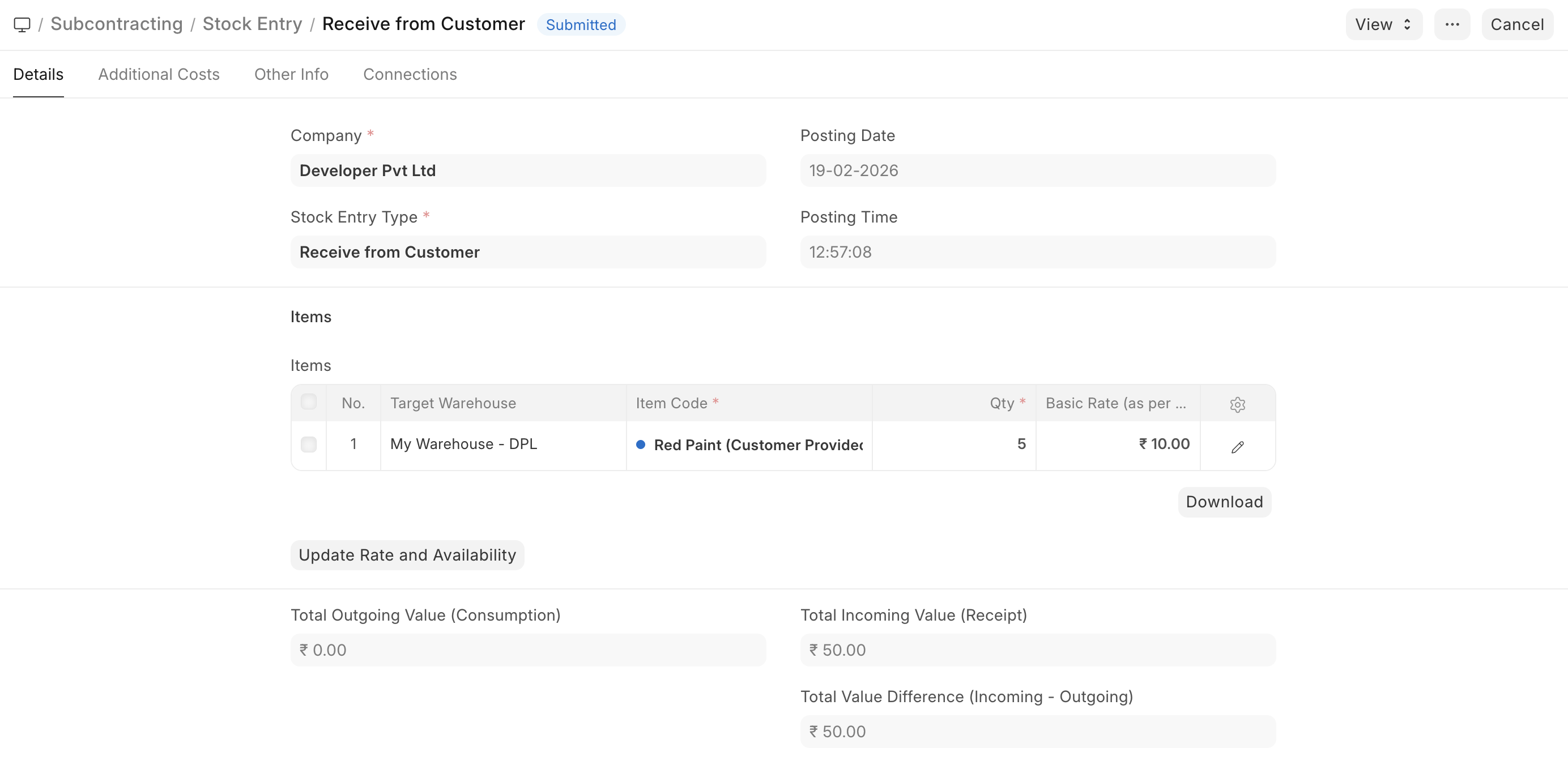 - It is also possible to create more Stock Entries to receive additional Customer Provided Items at any time, even after receiving the required quantity of the Raw Materials as per the Finished Good’s BOM.