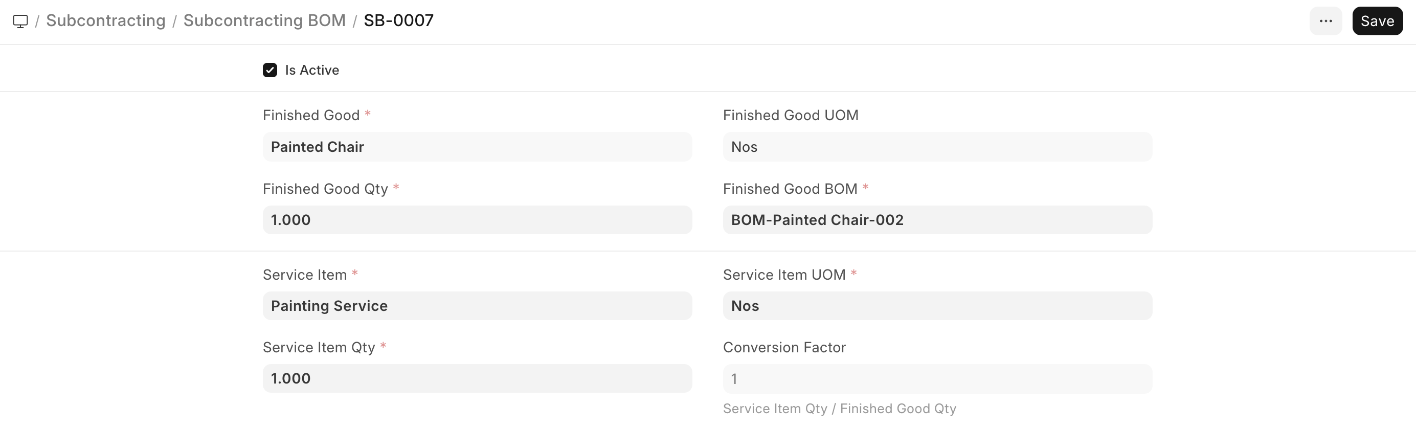 Item Codefield. If you have a Subcontracting BOM for this service item, the Finished Good field will be set automatically. Upon changing the quantity of the Service Item, the quantity of the Finished Good will also change based on the conversion factor in the Subcontracting BOM. If you have multiple Subcontracting BOMs for the same service/non-stock item, a dialog box will popup asking you to select the Finished Good from the Subcontracting BOMs present against that service/non-stock item. Save and submit once done.