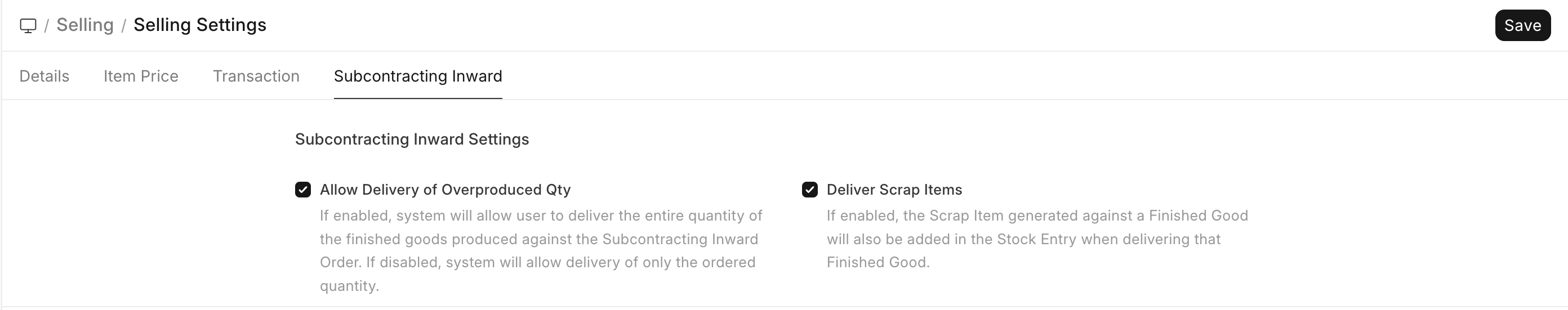 Deliver Scrap Itemsin theSelling SettingsSingle DocType. - ERPNext by default will only you to deliver the agreed upon quantity if Finished Good(s) as specified in the Subcontracted Sales Order. If you have produced more than the required quantity and want to deliver the overproduced quantity as well, enable the