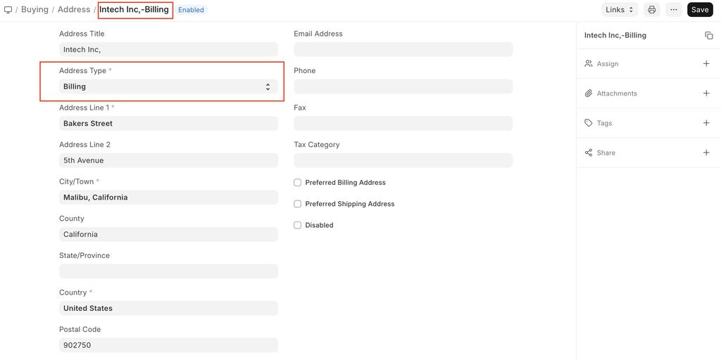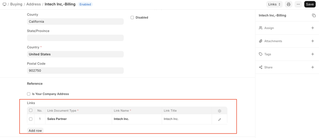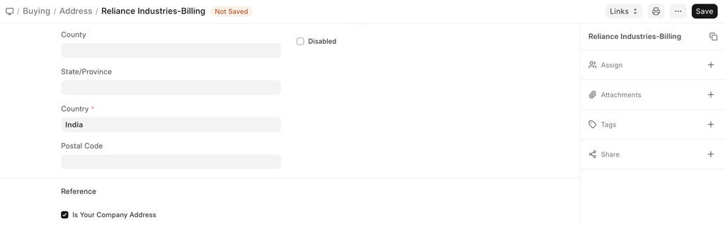- Enter Link DocType and Link Name to link this address to customer, supplier etc.