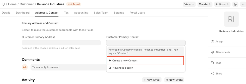 You can also add an Address from the Customer or Supplier record by clicking on “New Address" button as shown below.