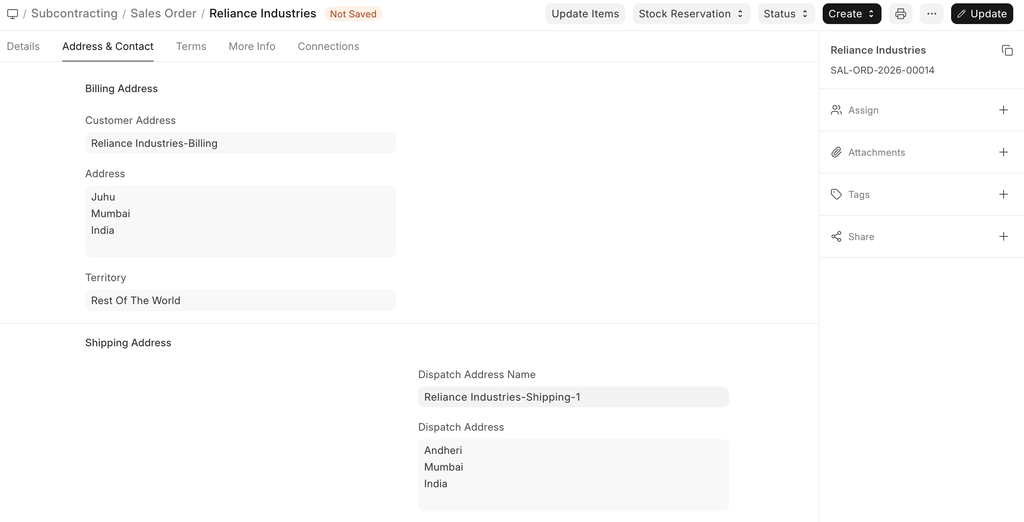 Similarly, if you check 'Preferred Billing Address', the address would be automatically added in the Billing Address in Sales Order, Sales Invoice and Delivery Note transactions.