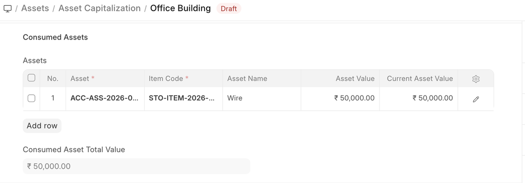 - The Consumed Assets will be depreciated (if configured for depreciation) till the posting date and Depreciation Journal Entries will be created in the background. Then they would be disposed of and their status would be set to "Capitalized".