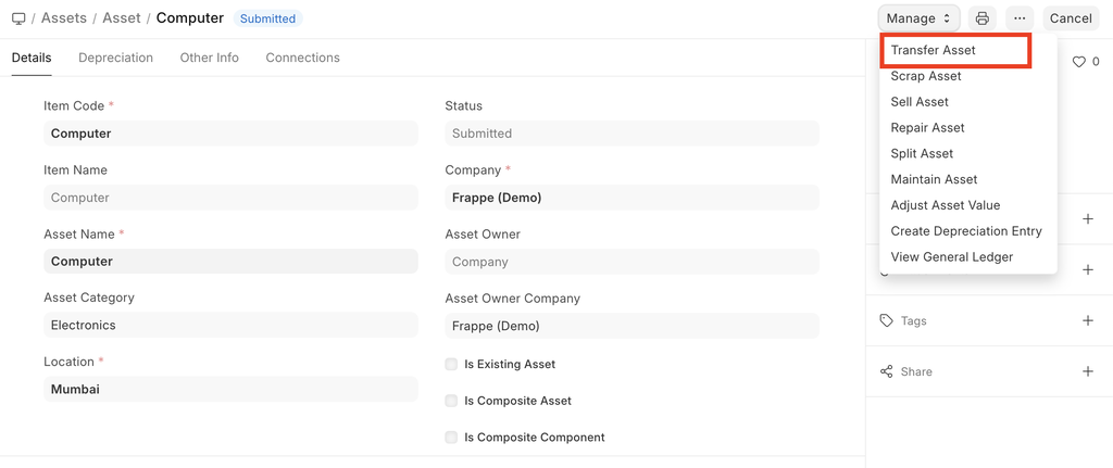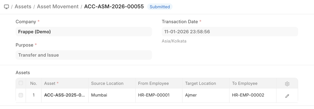 There is also a Transfer Asset option in the Manage dropdown on the top right of the Asset form to initiate Asset Movement. It auto fills available fields from Asset Form.