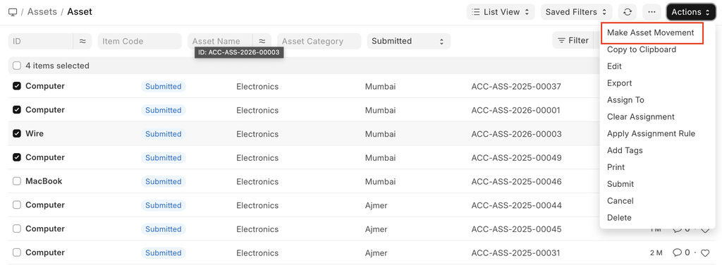To make an Asset Movement of a number of assets, it is advised to go to Asset List, select assets to be moved and click on Make Asset Movement from Actions menu on the top right.