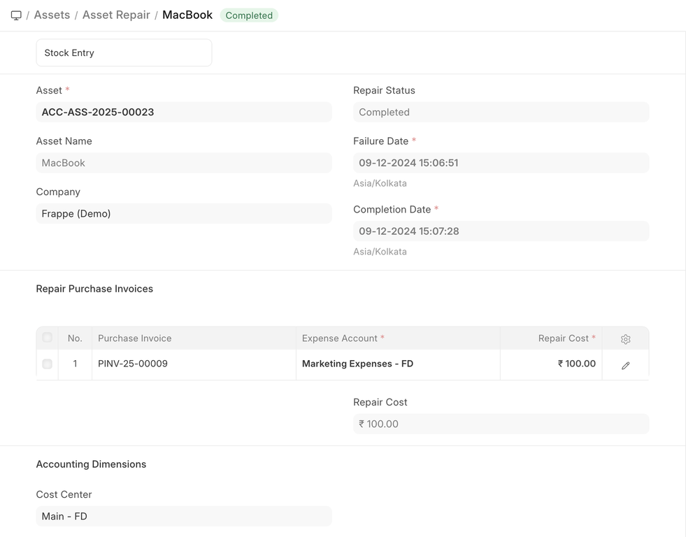 You can also maintain the records of Repair/Failures of Assets which are not listed in Asset Maintenance.
