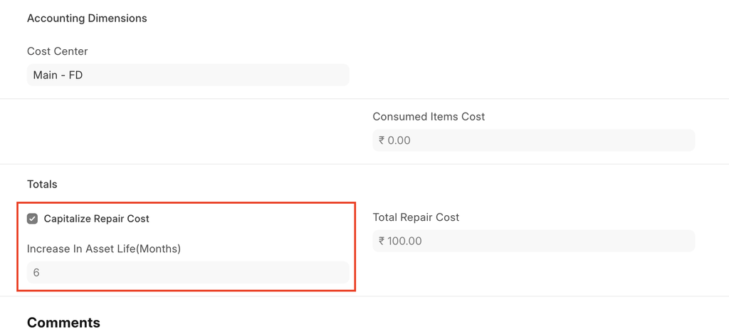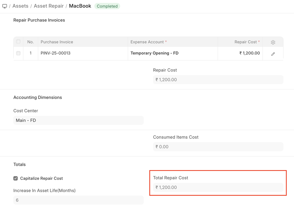 - Increase In Asset Life(Months): The number of months by which the Asset's life might be extended by the repair can be added here. This will modify the Depreciation Schedule of the Asset. This field will only be visible if Capitalize Repair Cost is checked.