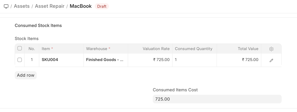 If Stock Consumed During Repair is checked, the Total Repair Cost will be computed based on the value of the consumed Stock Items and the Repair Cost entered.