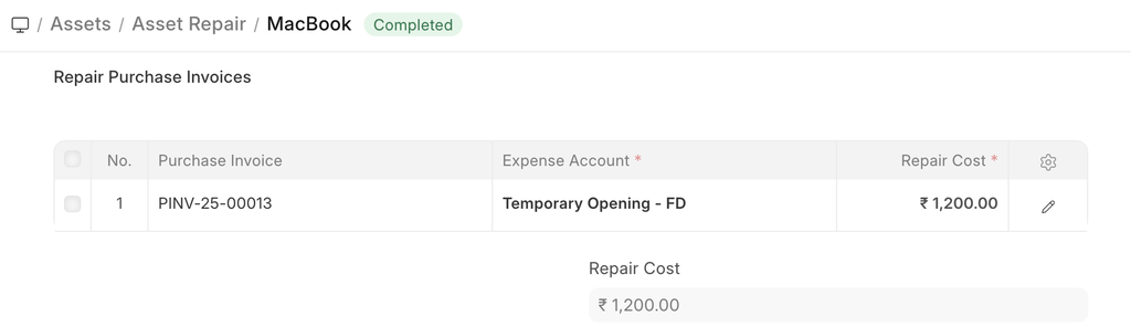 A Purchase Invoice can be linked with the Asset Repair, to account for any Items that need to be purchased to carry out the repair or the repair service offered.