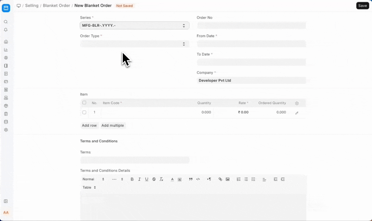 - Enter Item Code, Quantity and Rate in the Item table. You can also mention the Terms and Conditions for each item.