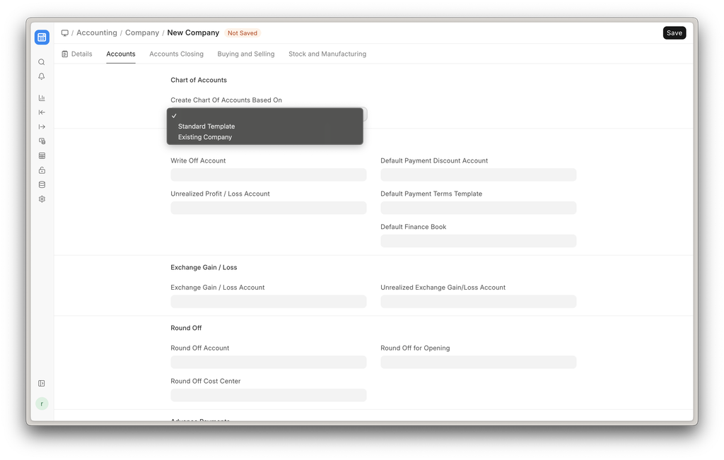 ERPNext has localized Chart of Accounts readily available for some countries. When creating a new Company, you can choose to set up the Chart of Account for it from one of the following options.