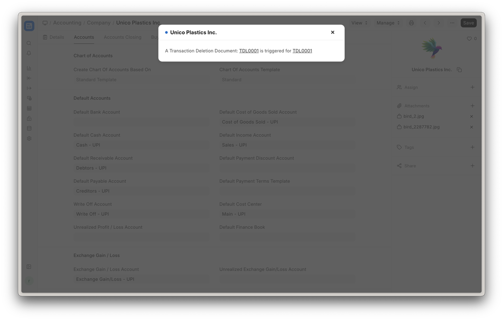 Within the Company master, you can set many of the default values for masters and accounts. These default accounts will help you in the quick posting of accounting transactions, where the value for the account will be fetched from the Company master if provided. As soon as the company is created, a default Chart Of Accounts and Cost Center is automatically created.