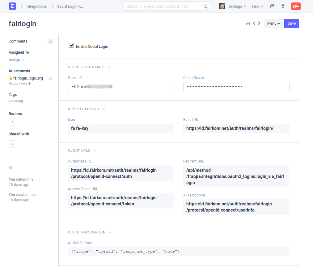 To enable fairlogin as an ERPNext login option, you need to configure the following parameters: