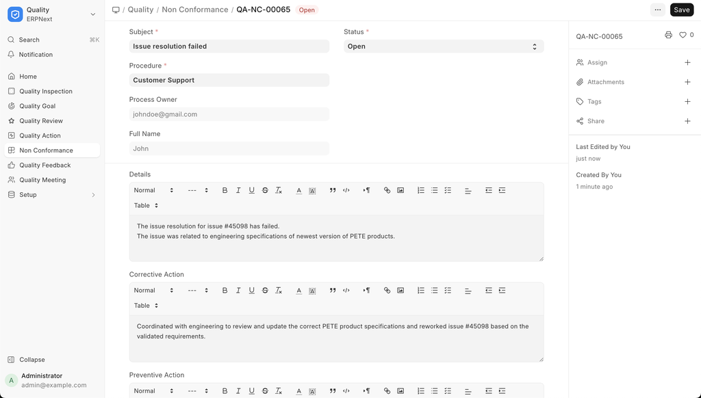 In ERPNext, you can create a Non Conformance by selecting the Quality Procedure against which it was observed, maintain its status and record corrective and preventive actions