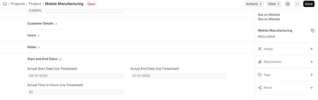 - Actual Start Date: Basis the Actual Start of the project, tracked via Timesheets, the Actual Start Date and Time of the Project will get recorded automatically.
