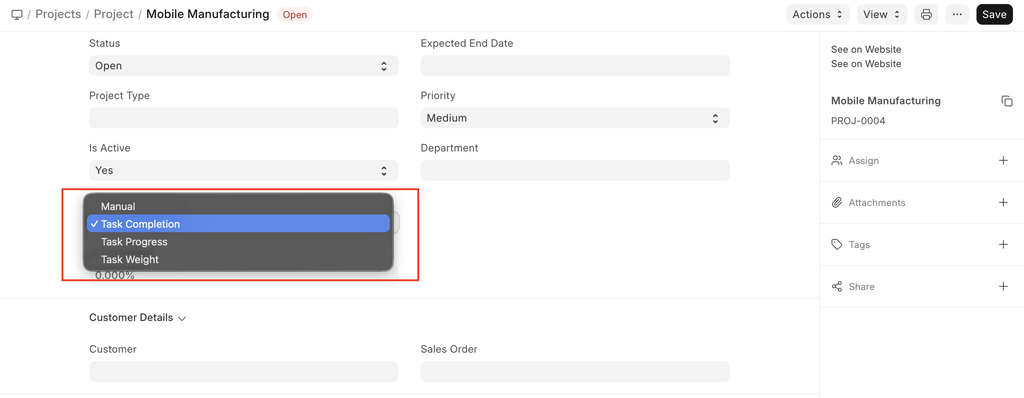 - Sales Order: If a Project is based on a Sales Order from a Customer, you can fetch the details here. This would enable you to update the Customer on the Progress on the project as per the Sales Order issued.