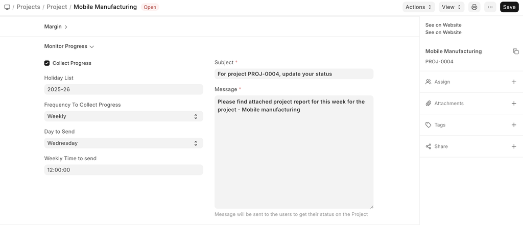 - Holiday List: You can select the Holiday List for your company. This will allow you to collect the Progress Reports only on the Working Days.