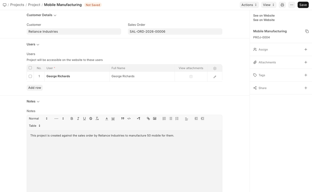 - Users: You can add any website user to give them access to this Project. E.g., you can add your customer as a Website User, to enable them to have access to your project to monitor progress and/or give any inputs/remarks. Similarly, a Supplier or a Contractual Employee/Freelancer who is involved in the Project can be added as a User.
