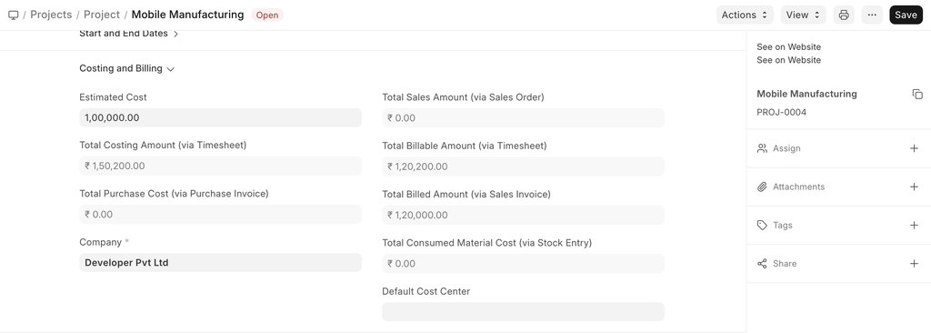 - Total Costing Amount: The system will automatically fetch the Total Costing Amount from all the Timesheets linked to this project.