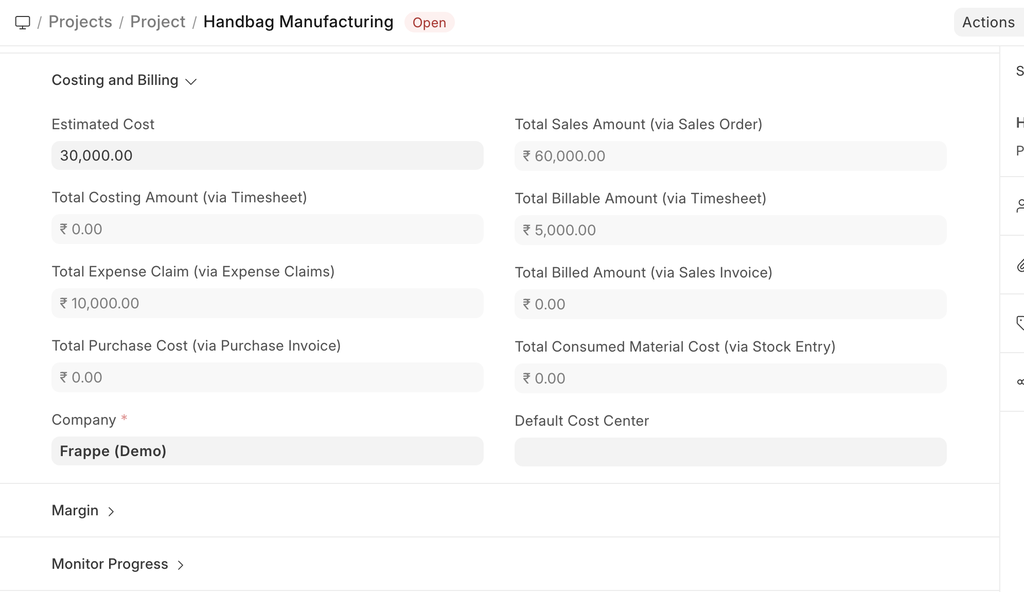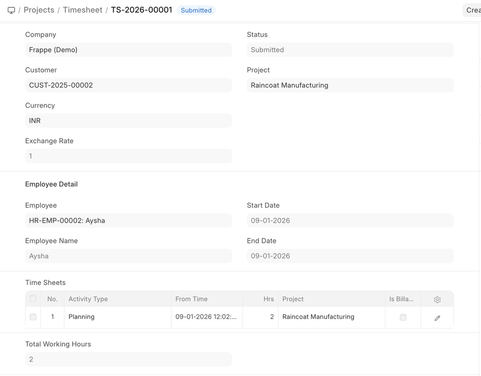 Same way, the Project cost will be updated based on Timesheets created against each of its associated tasks and the cost of the Project gets updated simultaneously.