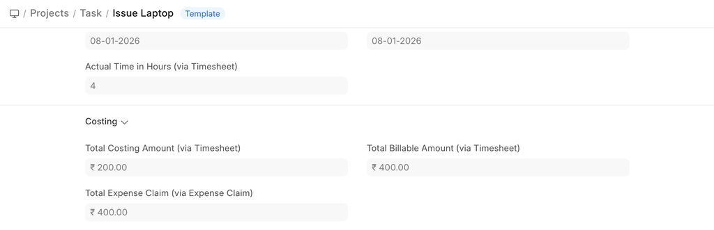 Based on all the Timesheets created for specific Tasks, its costing will be updated in the respective Task.
