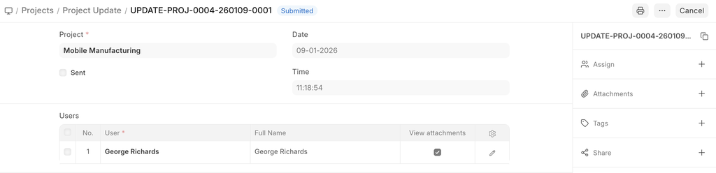 - You can select whether you want any particular User to view Attachments in the Project Update.